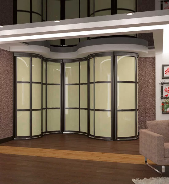 Радиусный шкаф-купе под заказ отличается от конкурентов оригинальной формой и изогнутыми дверями раздвигающимися по кругу. Дизайн радиусного шкафа скрывает углы комнаты, делает интерьер плавным и менее грубым.